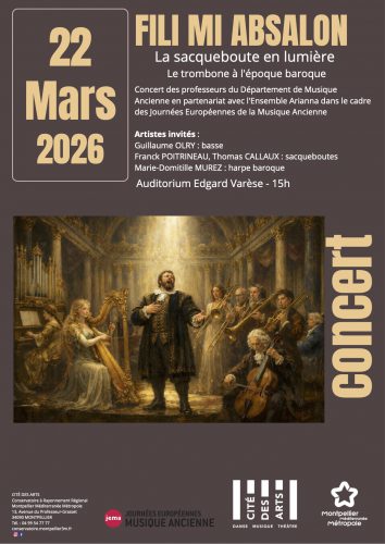 Cette année, la Cité des Arts et ses enseignants invitent Franck Poitrineau, musicien virtuose. Le programme qu’il propose offre un regard spécifique sur un instrument magnifique et incontournable, le trombone de l’époque baroque : la sacqueboute. Nous découvrirons ensemble de rares chorals à quatre sacqueboutes qui porteront la magnifique voix de Guillaume Olry, puissant chanteur basse. Ce programme, soutenu par l’ensemble Arianna, nous emmènera dans l’Allemagne de Schütz et de ses contemporains. Le son de la harpe baroque de Marie-Domitille Murez nous offrira de beaux moments de lumière dans des pièces intenses et dramatiques. C’est l’occasion pour l’équipe enseignante de mettre en valeur les jeunes stagiaires sacqueboutistes aux côtés des plus grands. Ce sera un grand moment pour eux, et un précieux souvenir pour nous tous. Ce concert nous rappellera que d’hier à aujourd’hui, la musique est une filiation, une longue histoire de transmission.